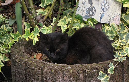 laufen der Katze nach zum Nachbarhaus, das mit dem Efeu. Dort sehen wir