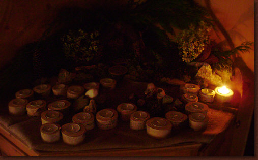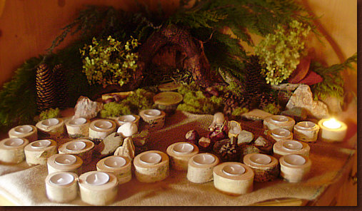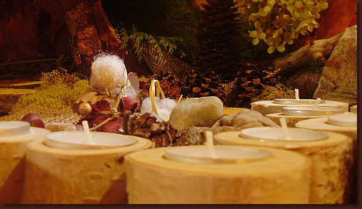 ... sehen wir nun die Teelichter, die in Birkenscheiben (als