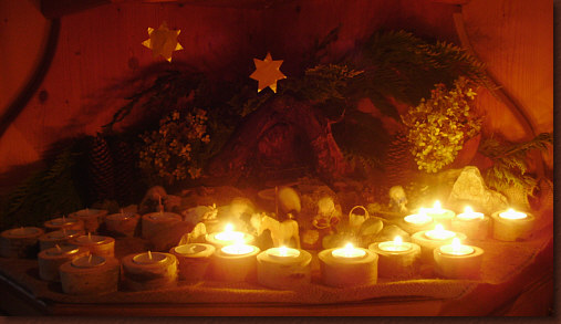 So sah es gestern aus ... ... und heute ist Lichterhalbzeit bei Marias Krippe: Ab sofort wird nicht nur mitgelaufen, sondern auch geflogen, denn eine Eule ist auch dabei: weiter