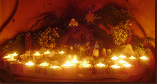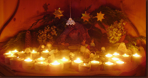 Lichtvolle Zeit ... ... schon jetzt, am Tag davor, so richtig feierlich: Wichtig für den morgigen Tag ... ... ist die Futterkrippe, die nun gefüllt auf hungrige Gäste wartet. weiter