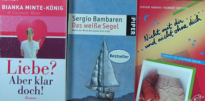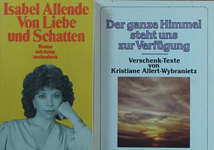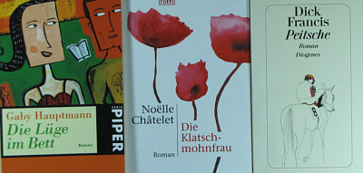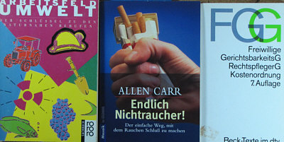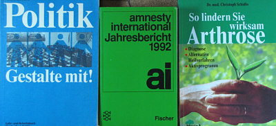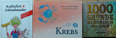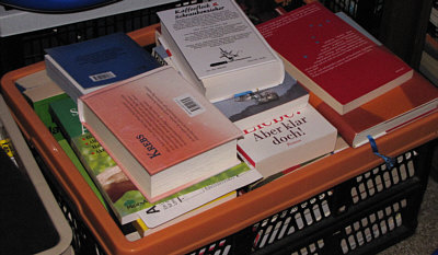 Zuerst einmal: ein ganz großes Dankeschön an Alle, die Beate und mir in Wort, Bild und anders ein frohes Weihnachtsfest gewünscht haben. Ich schaffs leider nicht, individuell zu antworten und möchte deswegen auf diesem Weg danke sagen :)). -- Thema heute: Aber selbstverständlich löse ich auf, was in den gefundenen Beuteln mit Büchern ... ![]() ... die ich nach Hause ... ![]() ... mitgenommen hatte, drin ist. Gestern war Bescherung dieses herrlichen vor die Füße gefallenen Weihnachtsgeschenkes: ![]() ![]() ![]() ![]() ![]() ![]() ![]() ![]() ![]() ![]() ![]() ![]() ![]() ![]() ![]() ![]() ![]() Eine ganz ganz tolle Zusammenstellung ... ein paar Bücher sind für den Müll, einige ganz nett, einige super, ein paar kann ich sehr gut gebrauchen, und ein paar davon werden ganz bestimmt mal beim Seelenfarbenlotto auftauchen. Ich frag mich gerade, ob man sowas auch finden würde, wenn man die Straßen abläuft, um zu suchen, ob da nicht Büchertüten dabei sind oder ob einem sowas nur per Zufall begegnen kann. War 'ne richtig schöne Bescherung :)). |