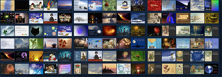 Viele viele kleine Bildchen ... ![]() ... das sind alles Grußkarten. Genau gesagt: das sind die Seelenfarbenkarten für Silvester und Neujahr, die man seit gestern Abend verschicken kann. Ich hab mich auch gestern nur darum gekümmert und kaum was anderes gemacht und deswegen ist das nun auch Thema im Kalenderblatt. Die Karten können hier verschickt werden und ob sind fast alle in klein zu sehen. Diese Karte ... ![]() ... war (mit 2009 drauf) im vorigen Jahr die meistverschickte Silvester/Neujahrskarte. Die weitere erfolgreichen Karten 2009: ![]() ![]() ![]() ![]()
