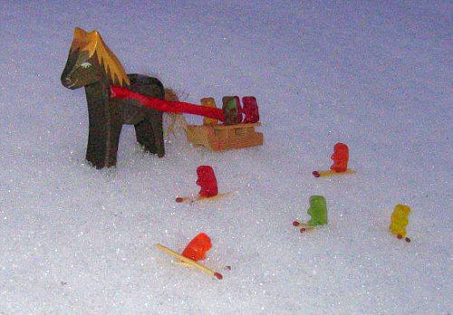 Das sind die Gegner: ![]() Das ist Bildermäusels ... ja, was genau ist das denn ? Die Fremdenlegion ? Die bunten Krieger ? Es ist die Terrakotta-Armee ;)). Man kann natürlich auch so dazu sagen: Eine Kiste, hart gewordene Bären drauf geklebt, und dann mit Rohrzucker aufgefüllt. Der Ideen gibt es viele ... und ... wie schön ... sie dürfen hier betrachtet werden :)). -- Aber ... tröstet Euch ... die Geschichte geht so aus: Die Piraten verfahren sich und landen auf Grönland, wo sie noch lange frisch bleiben. Die Rohrzucker-Bären wurden von einem Scheich aufgekauft und werden nun zu Beschützern des Gummibärenharems ausgebildet. -- Nun aber von der Wüste zurück in das aktuelle Wetter und in die aktuelle Zeit ... es ist Olympia und auch die Bären gehen hin. Pferdeschlittenfahrt und Bärenslalom stehen auf dem Programm: ![]() Die Bine ist übrigens die Trainerin der Olympia-Mannschaft. -- Das war Folge 3 ... mit Tanz und Schwert und Sport von Beate, Beate, Bettina und Bildermäusel. Bin mal selbst gespannt, was die morgigen Bären so alles machen werden ...