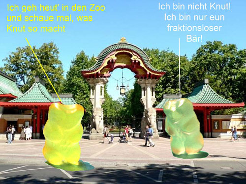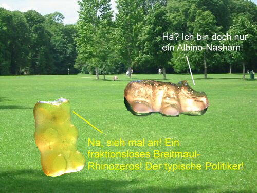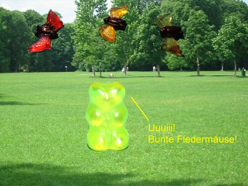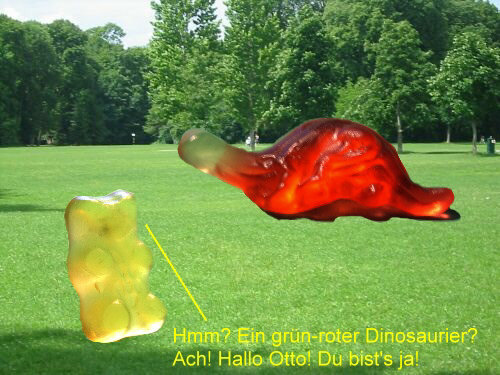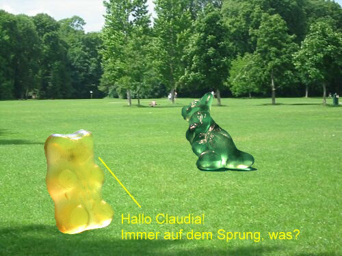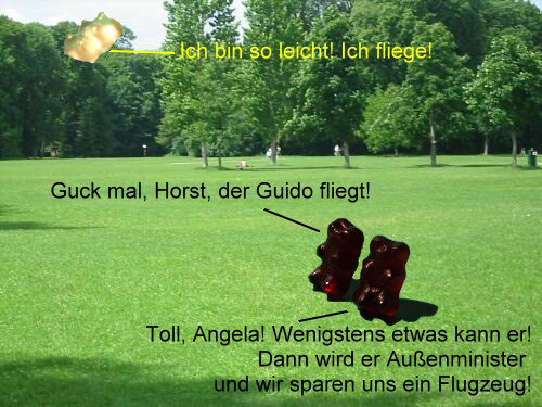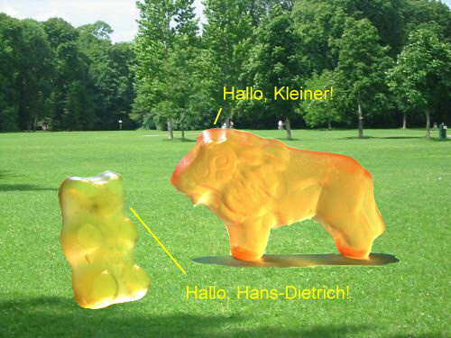 Sie passen ja gut zusammen ... Politik und die närrischen Tage. Denn jetzt darf man ein paar Witze mehr machen als sonst ;)). Einer der politischsten Bären der Gegenwart ist Guido, der Gelbe Er ist richtig prominent ... und ein Tierliebhaber. Darum ging er vor kurzem in den Zoo: ![]() Danach spazierte Guido auf eine Wiese ... und dann ... ... aber seht selbst: ![]() ![]() ![]() ![]() ![]() ![]() ![]() ![]() ![]() Wie gut, dass Christian auch im Zoo war und die Abenteuer des Guido W., der auf einmal so leicht wurde, fotografiert hat. -- Zum Schluss gibts noch Gummi ohne Bär ... weil Christine B. keine Bären im Hause hatte und es Samstag war und die Geschäfte schon geschlossen waren. Dafür waren noch Lachgummis da ... und das hat dann ... ... die Christine ganz wörtlich genommen: ![]() -- Ebenfalls lächelnd sage ich Euch, dass das Folge 4 war mit Birgit W., Christa, Christian, Christine ... und mit Ordnung, Farbe, kulinarischen Finessen, Politik und mindestens einem Lächeln.