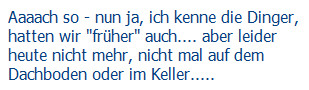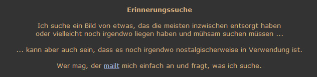 Auwei .... das wird schwierig. Such such such ... das hat jetzt ein paar Minuten gedauert, aber so ein Computer ist ja etwas Wunderbares ... der kann suchen, sortieren und irgendwie findet man das, was man sucht, dann doch. Was suche ich ? Falsch ... es muss "was suchst du" heißen. Aber dennoch bin ich der, der etwas sucht. Verwirrt ? Kann ich verstehen *gg*. Jetzt aber erst ... nochmal selbst suchen ... viel suchen ... bis ich endlich die Seite gefunden habe, wo ich damals gebeten habe, mir bei der Suche zu helfen: Damals ... am ... herrje ... 25. August 2009 ... gabs im Lichtblick diese Rubrik: ![]() Ganz schön rätselhaft, gelle ? Soll ja auch so sein ... wenn ich immer alles verraten würde, dann wäre Seelenfarben nicht so spannend ... und das darf nicht sein. Jetzt ... 7 Monate später ... ist irgendwie der richtige Zeitpunkt gekommen, mal die Mails zu suchen, die ich erhalten habe. Und dann mal zu sehen, ob überhaupt und wenn ja, wer mir helfen konnte. Ist eine Sache, die es früher in fast jedem Haushalt gab ... und dann ... ... kam der Zahn der Zeit und heute ist das Dingsda Nostalgie. Oder vielleicht doch nicht ? Vielleicht wieder modern ? Grübelt doch mal bis morgen so vor Euch hin, was es sein könnte. Ein paar Hinweise: - das Dingsda ist klein - das Dingsda ist hauptsächlich nützlich, aber auch dekorativ - das Dingsda wird meistens nachmittags, sonntags und an Geburtstagen eingesetzt - ich hab sowas nicht mehr (sonst hätte ich ja nicht danach gefragt) - meine Mutter hatte sowas - jeder kennt das Dingsda - das Dingsda ist eine Erfindung aus dem 50er Jahren - es war die erste Erfindung einer Firma, die Haushaltswaren herstellt und die es heute noch gibt Ich hab dann alle, die mir gemailt hatten, gesagt, was ich suche. Eine Antwort war: ![]() Frohes Grübeln ... aber morgen schon gibts das große "aha" und "achja"-Erlebnis :)). |