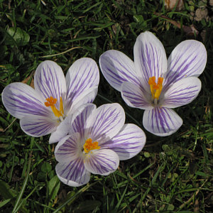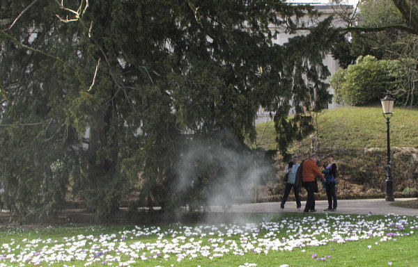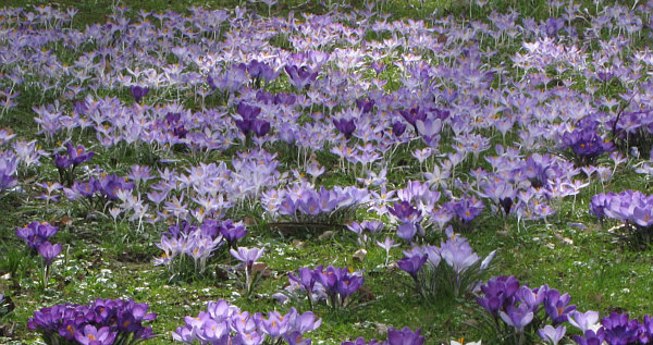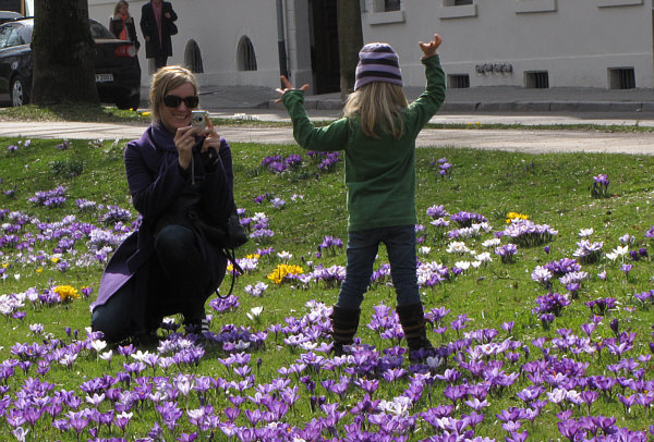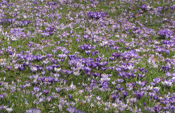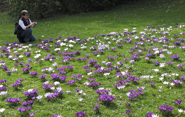 Doch ... wirklich ... es gibt Seelenfärbler, bei denen erst in diesen Tagen die Krokusse blühen. Da zeige ich mich heute ganz solidarisch und bringe auch nochmal Krokusbilder. Ich war doch in Baden-Baden und hatte davon auch schon die klassisch schönen Krokusbilder gezeigt ... doch es gibt noch mehr Fotos, die Euch etwas erzählen wollen ... und als allererstes gibts ein Bild von der Ilse, die ja mit mir gefahren war: ![]() Nein, die Ilse ist nicht 1,40 groß ... die Perspektive täuscht. Im übertragenen Sinne stimmt es aber: der Mensch wird klein, wenn er eine solche Blütenpracht sieht. Wir waren bei weitem nicht die einzigen, die fotografiert hatten ... siehe hier: ![]() Ein richtig schöner Schnappschuss und ich muss sagen, das junge Mädel hat sehr schön aufgepasst, dass es nicht auf die Krokusse getreten ist. Was keine Selbstverständlichkeit ist ... so manches Kind trampelt unbeaufsichtigt drüber. Ich würde den Beiden ja gerne dieses Bild schicken, aber wie finde ich raus, wer sie sind ... hmm. Es gibt ja Krokusse und Krokusse ... zuerst blüht ja die frühe Variante, die kleinere Blätter hat und erst später die mit den größeren Blättern. Meistens blühen entweder die einen oder die anderen ... in Baden-Baden war es auch so: ![]() Das, was so unaufgeräumt zwischendrin in klein zu finden ist, sind die frühen, schon arg mitgenommenen kleineren Krokusse. Ein paar Meter weiter durfte ich ... welche Seltenheit ... beide Varianten gleichzeitig und sogar beide noch und schon blühend fotografieren: ![]() Die früheren haben schmalere Blätter, sind heller und öffnen sich weiter. Die späteren sind größer, fester, geschlossener und hier gibt es dunklere Varianten. Apropos Varianten ... da gibt es einige bei den Krokussen: ![]() ![]()