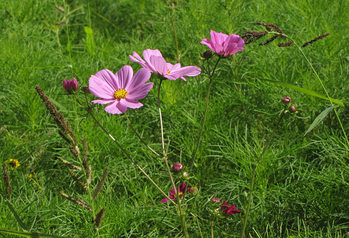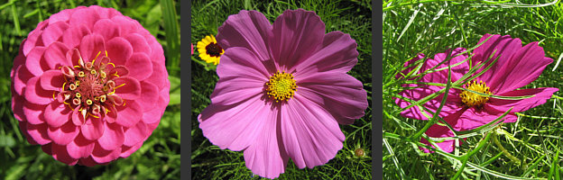 Zinnie, Cosmea frei und Cosmea im Grünen ...
