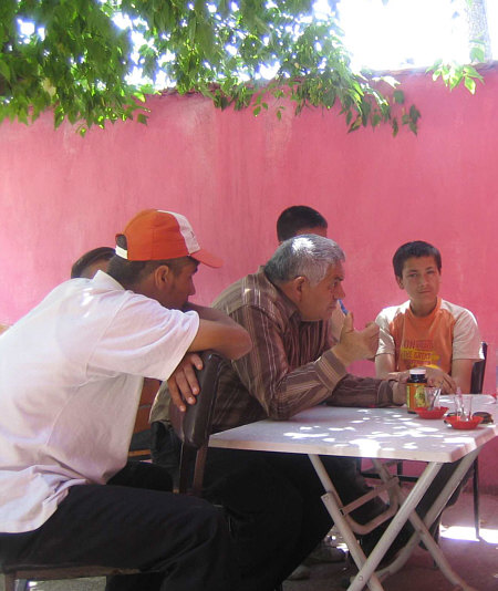 In der rosa Ecke des Cafes werden wir von den Einheimischen befragt