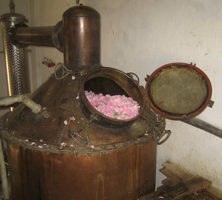 Während allmählich aus den angelieferten Rosenblüten das Destillieren