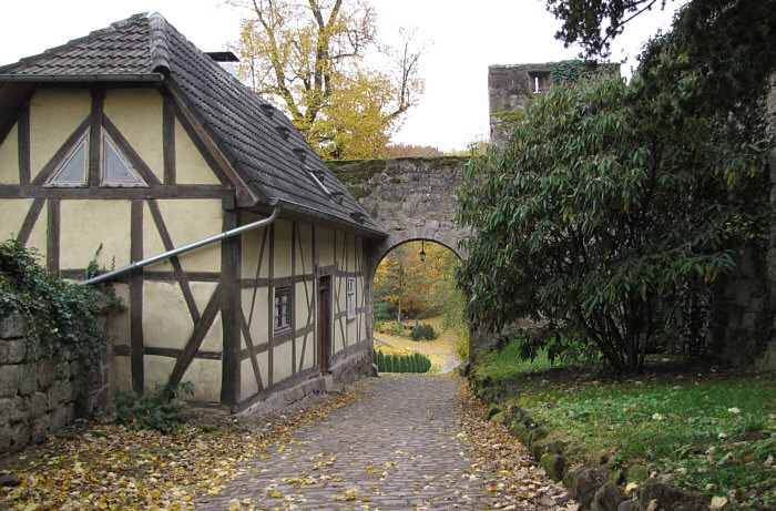 dem alten Tor, dem Pizzaboten, dem Tor aus Holz, der Kirche,