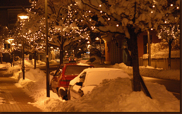 den gehäkelten Zuckerbäckerkunstwerken und dem Schnee am Abend.