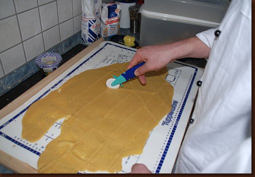 1-2 Stunden kalt stellen, danach auswellen und Dreiecke (Kantenlänge