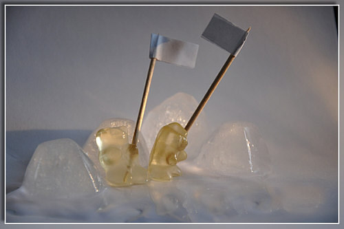 Er sieht zwar so aus, als würde er grinsen ... ![]() ... aber das nennt sich "Verzweiflungslachen" und ist gar nicht lustig. Eben noch hat er "my heart will go on" gesungen, und dann ist das blöde Schiff gesunken und nun sitzt er da so rum. Genau wie diese beiden da ... ![]() ... das sieht zwar alles romantisch aus, aber Abendsonne bei minus 12 Grad ... ... lässt aus Gummibären Eisbären werden. Die beiden da oben ... nein, sie sonnen sich nicht ... sie sind erschöpft, denn wären sie munter, würden auch sie um Hilfe rufen: ![]() Das war der Film "Titanic" in der Bärenversion. Die Regisseurin Gabi K. zeigt uns gleich wie sie den Film gedreht hat ... |