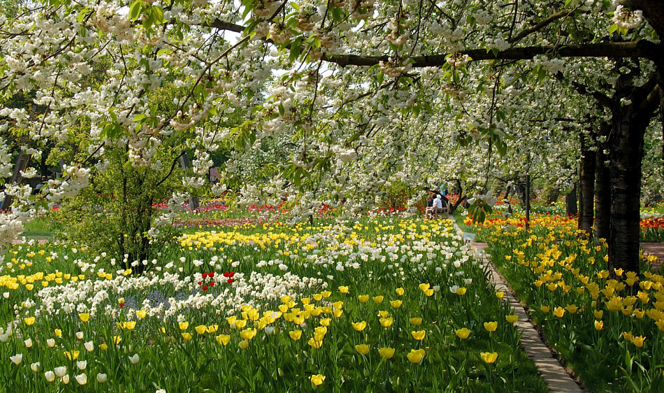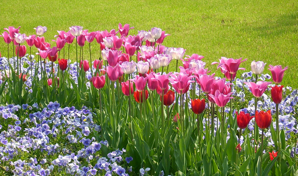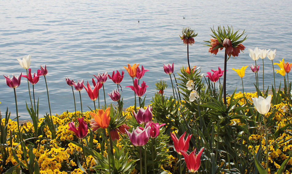 Tulpen, Stiefmütterchen und Kaiserkronen mit herrlicher Aussicht auf