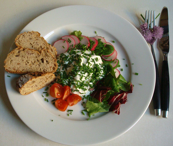 das ist Quark, herzhaft angerührt, mit viel Salat (Radieschen,