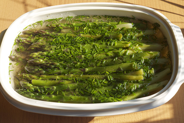 Mit dem Spargelsud wird eine Essig-Öl-Vinaigrette gemacht (Essig, Öl,