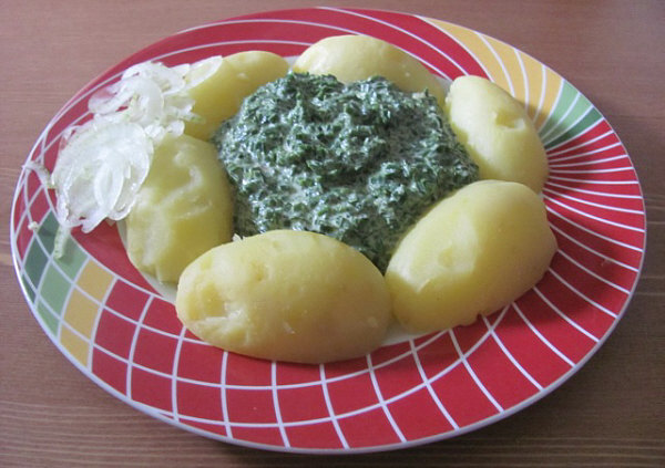 Dazu gab es Pellkartoffeln und fein gehobelte frische Zwiebeln.