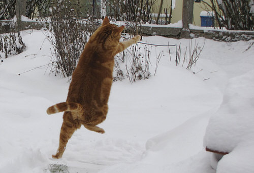 Mickey mitten im Sprung, auf dem Weg, von Beate geworfenen Schnee zu