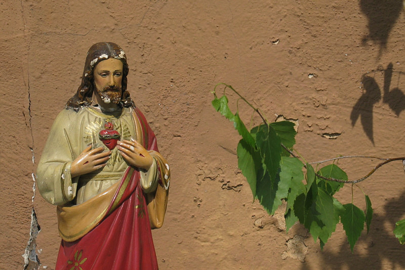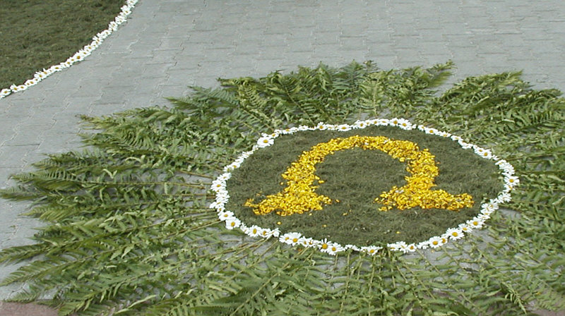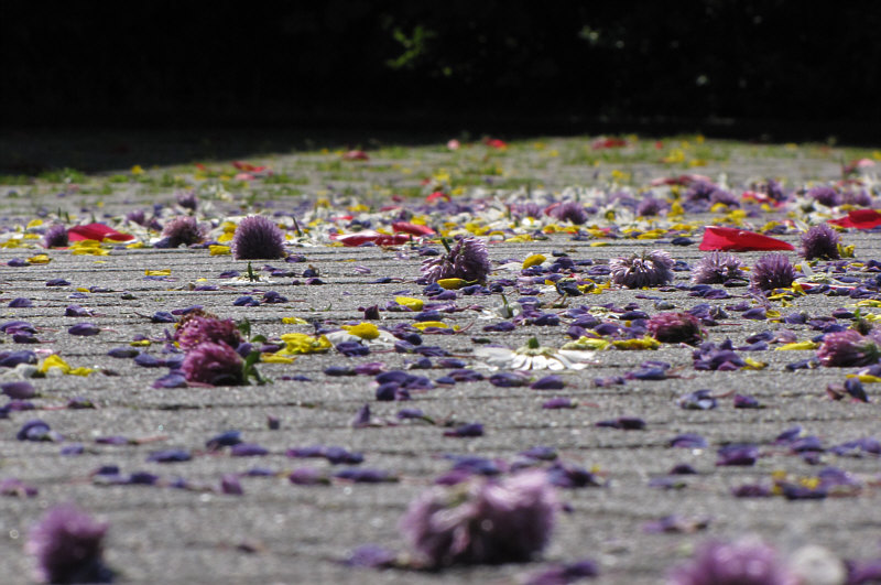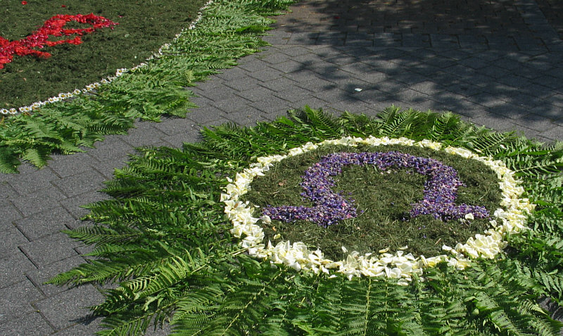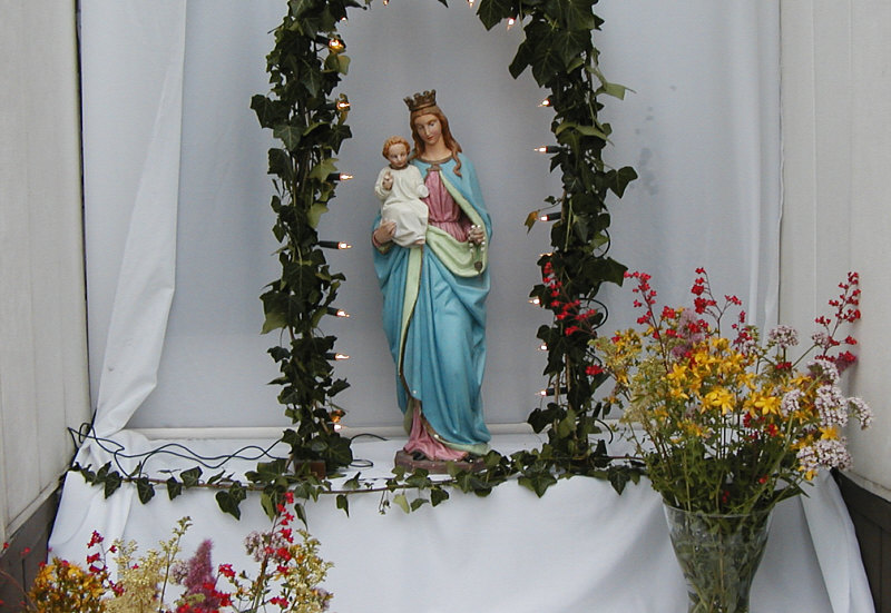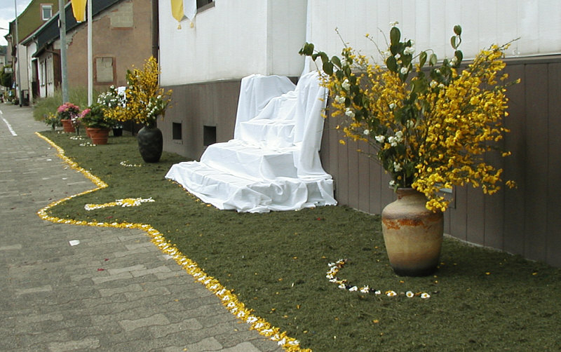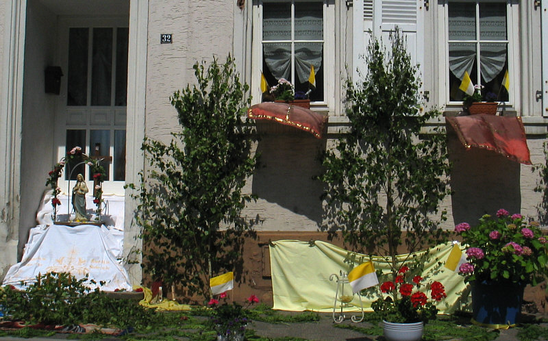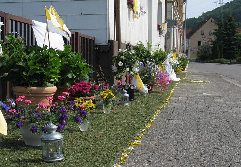 Prozession, Ornamente aus Blumen, kleine Altäre vor den Häusern.