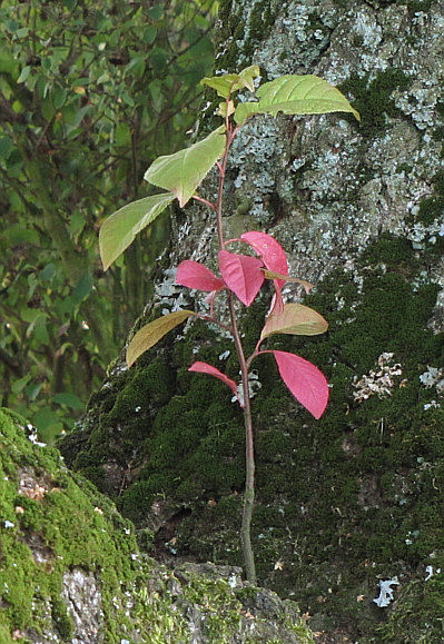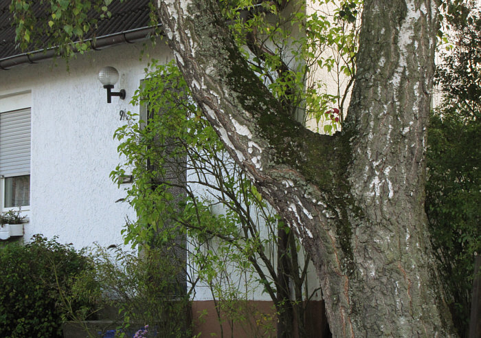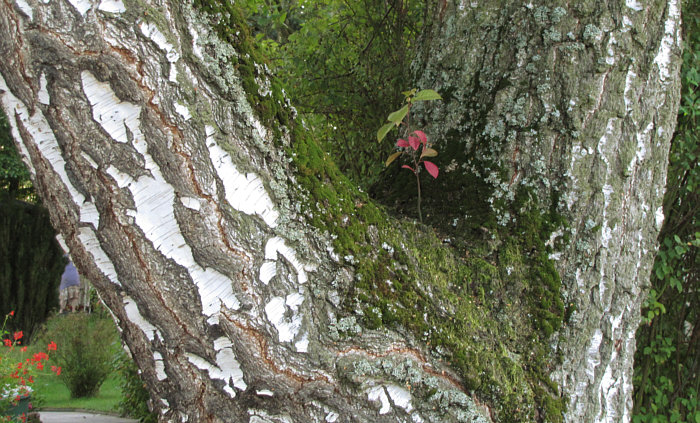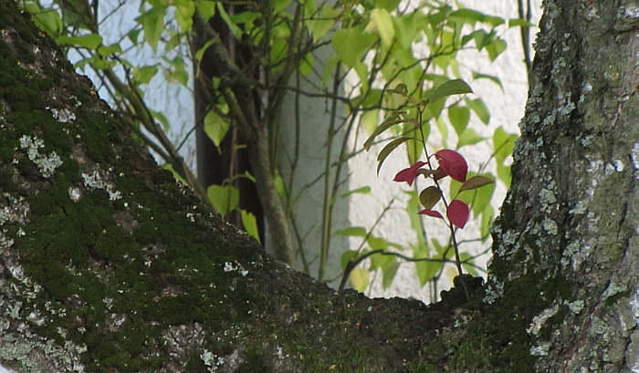 ... fällt auf, dass da etwas Rotes zwischen den beiden Stämmen zu sehen