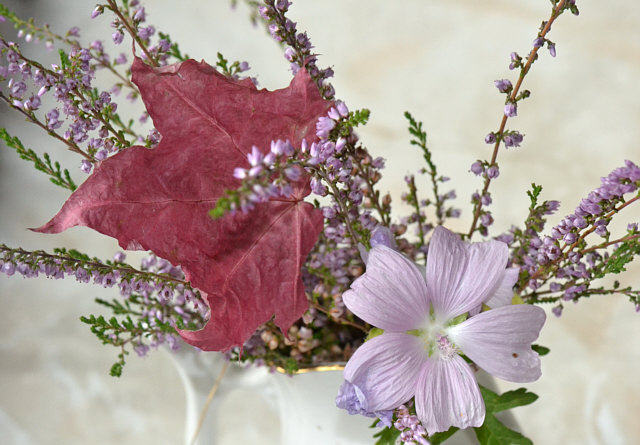 ... ein Blatt-Blüten-Arrangement in zarten Violettönen.