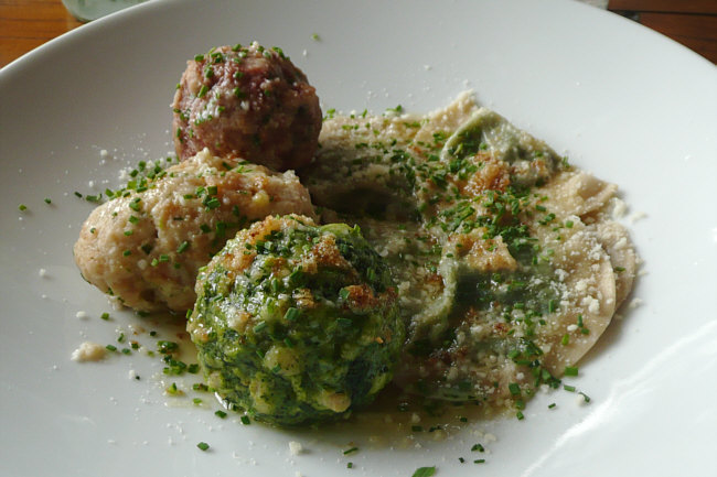 ... ein Knödel mit Käse, einer mit Rote Beete und einmal mit Spinat.