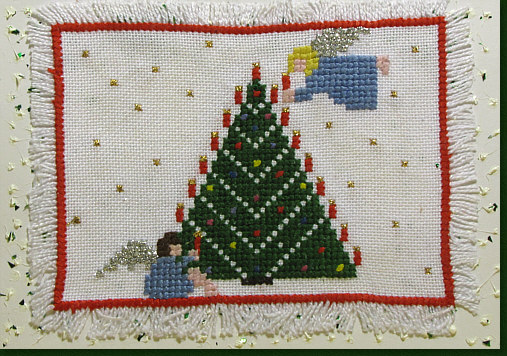 Mit Weihnachtsbaum und zwei Engeln, die diesen schmücken.