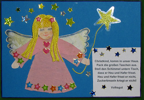 Ein blonder Christkind-Engel mit Sternenkleid und Gedicht.