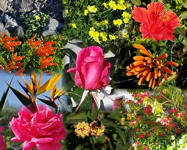 Jasmin, blühende Mandelbäume, Strelitzien und vereinzelt Rosen und Hibiskus.