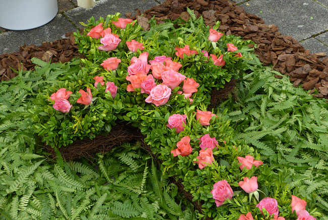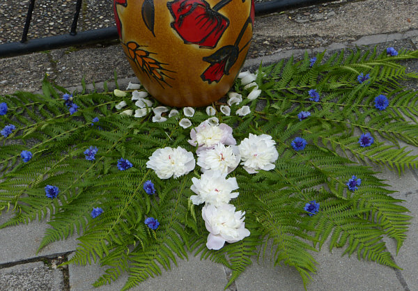 ... in einer Mohnblumenvase, zu deren Füßen ein Kreuz aus Pfingstrosen