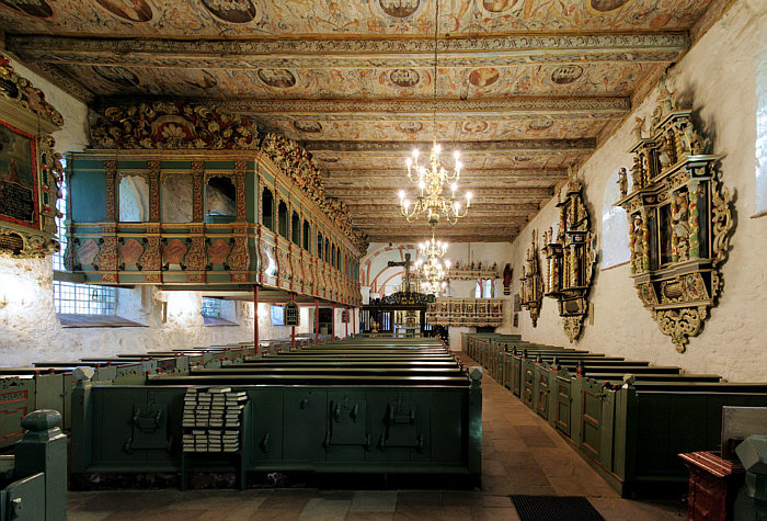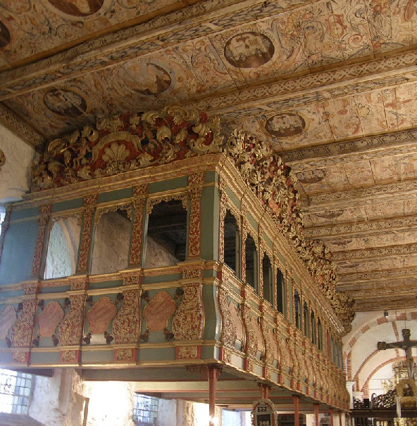 Die phantastisch bemalte Holzbalkendecke und die Empore: