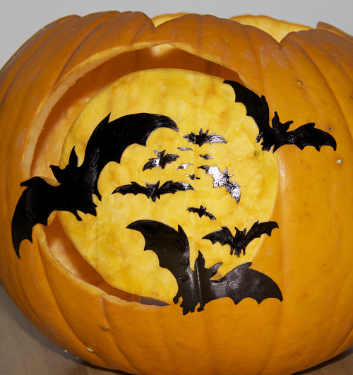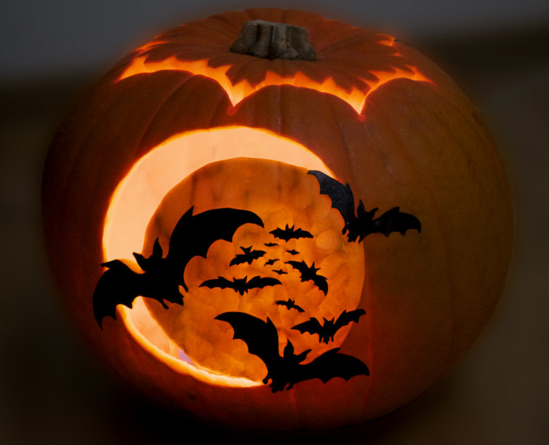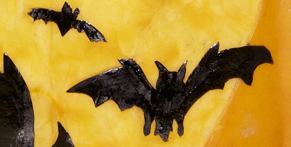 Das Früchtchen und das Messerchen. Was ist die Steigerung ? Die Frucht und das Messer. Noch höher, größer ? Die Riesenfrucht und das große Messer. Huuuuuh ... Uaaaaah .... Huuuuuaaauuuh ... und nun ... ... sind wir in Stimmung für das heutige Kalenderblatt ;)). Die Riesenfrucht fängt mit K an und man kann sie aushöhlen. Oder man schnitzt Gesichter hinein. Oder Fratzen. ![]() Wer nun aber Angst vor dem Messer hat oder lieber malt statt schneidet, der kann auch einfach nur ein paar Fledermäuse auf den Kürbis malen: ![]() Was nun aber, wenn jemand gerne schnitzt "und" malt ? Dann heißt sie Doris, ist Seelenfärblerin und kommt aus der Schweiz. ![]() Links sieht man, dass der eine Flügel der Maus liebevoll nicht ausgeschnitzt wurde, was bedeutet, dass sich da jemand schon beim Schnitzen ganz schön Gedanken gemacht hat. Und löschen wir mal das Licht außen ... und lassen es dafür im Kürbis drinnen hell werden: ![]() |
