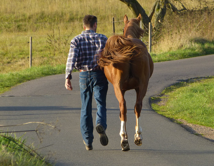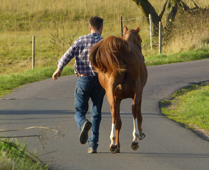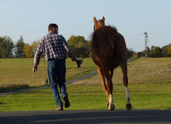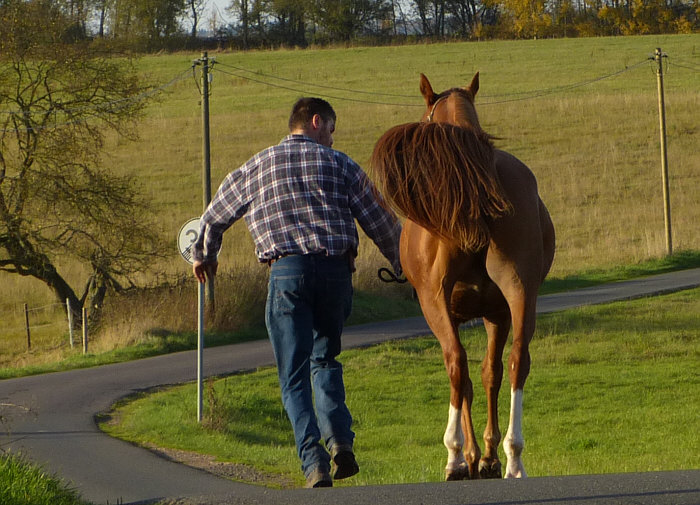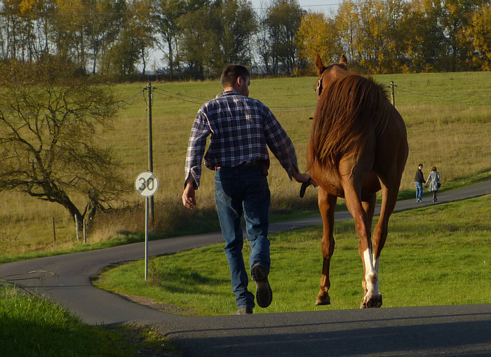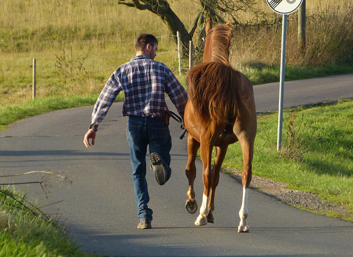 Laufen sie nebeneinander her und er führt das Pferd am Zügel dabei ?