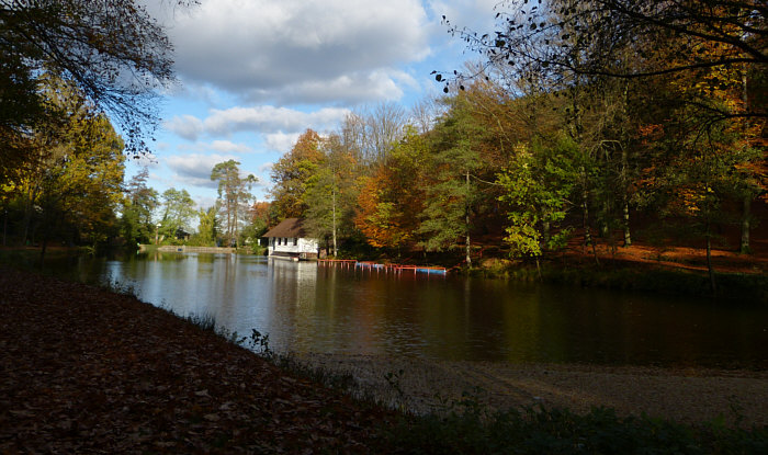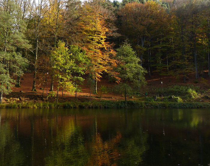 und schauen, wie sich die Herbstfarben im Weiher spiegeln: