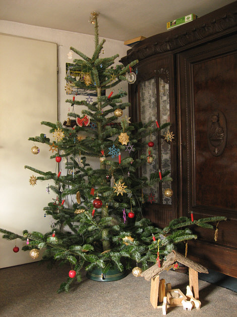 Von dem Uralt-Schmuck mal abgesehen, hängt dort größtenteils nur Zeug, das die Familie im Lauf der Jahrzehnte selbst gebastelt hat. Die Krippe hat Opi nach einer Vorlage selbst ausgesägt. |