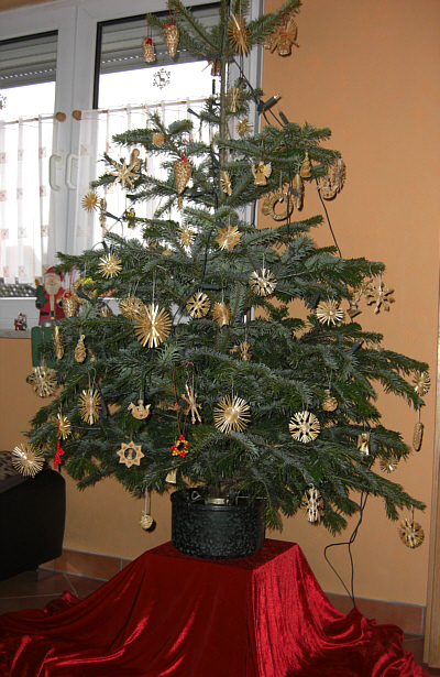 Früher waren es bunte Kugeln oder auch mal nur rote, nach Lust und Laune. Heute, seit etwa 8 Jahren, schmücken wir den Baum mit Strohsternen und kleine Holzfiguren. |