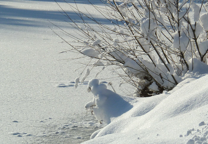 ... doch tatsächlich ein Schneemann am Wasser und angelt.