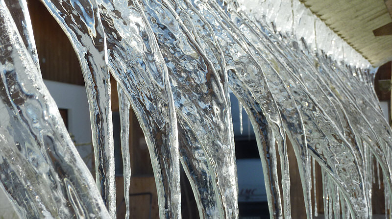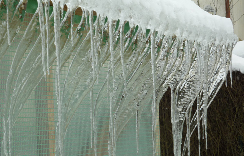 Eiszapfen, die im Bogen Richtung Gewächshaus gewachsen sind