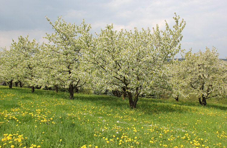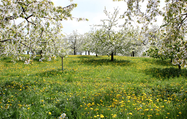 Frühling für Mensch und Tier im Kalenderblatt mit blühenden Bäumen,