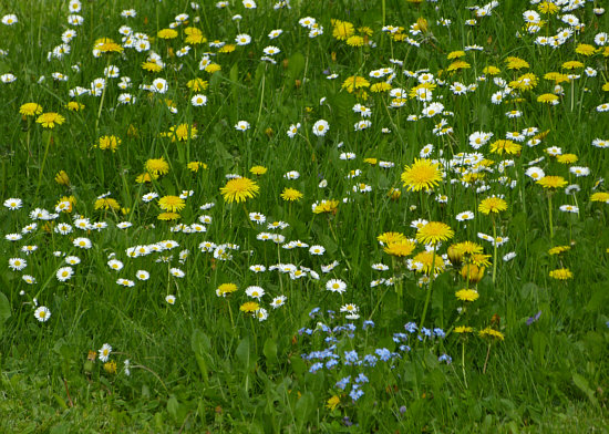Mehr Wiese als Rasen mit Gänseblümchen etc.