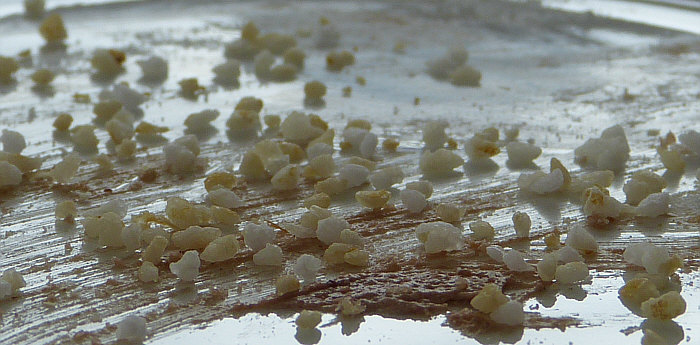 Sandkörner oder winzige Steinchen in einer Pfütze