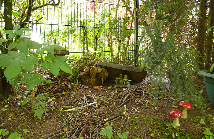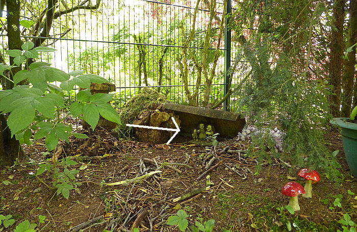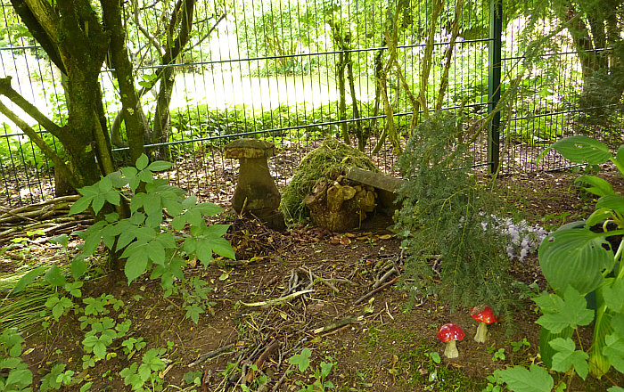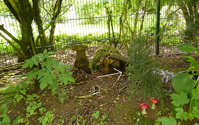 Dort hinten am Zaun, hinter den roten Pilzen ...