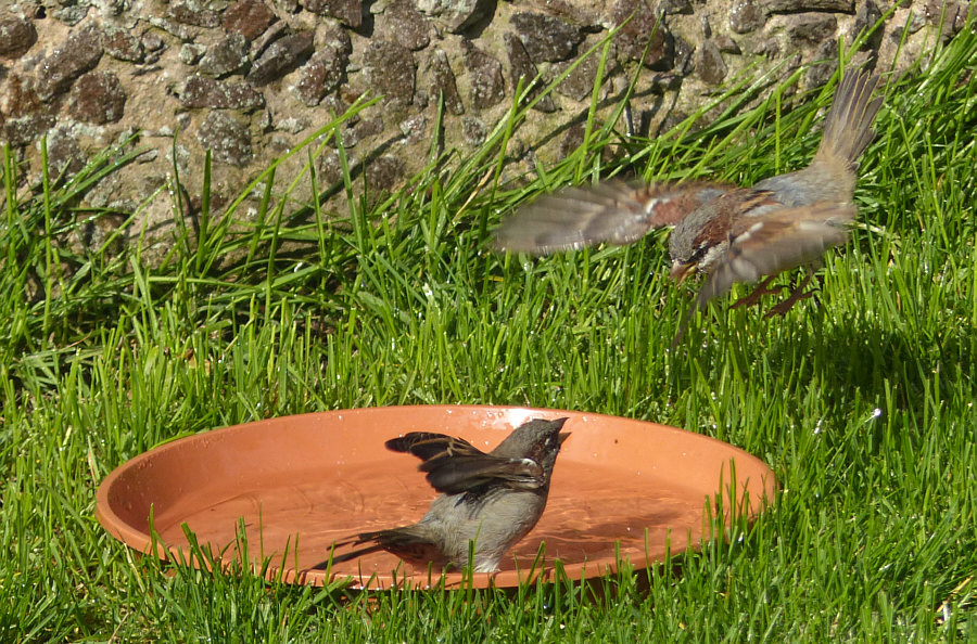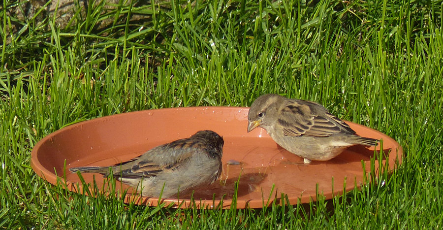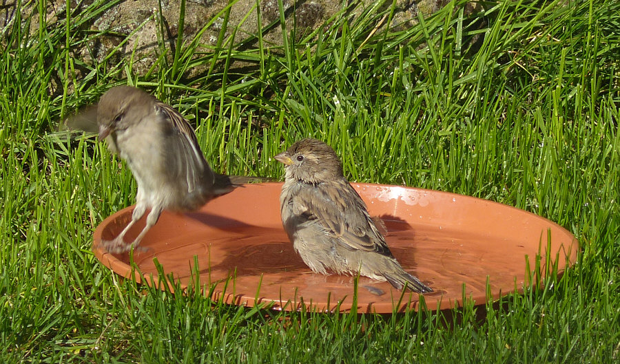 Hier ist zum Vergleich ein älteres Spatzenweibchen im Swimmingpool: