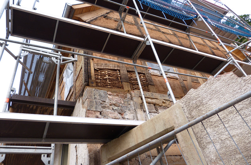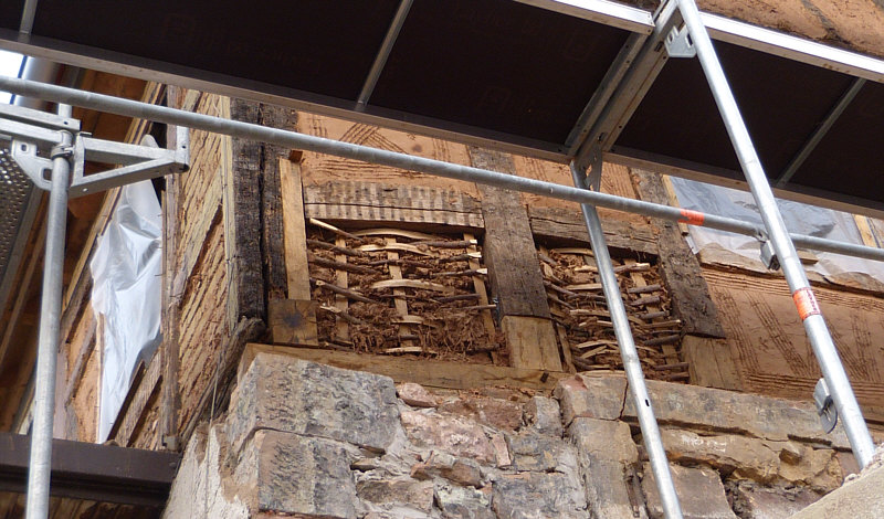... sieht die Wand eines Fachwerkhauses innen aus.