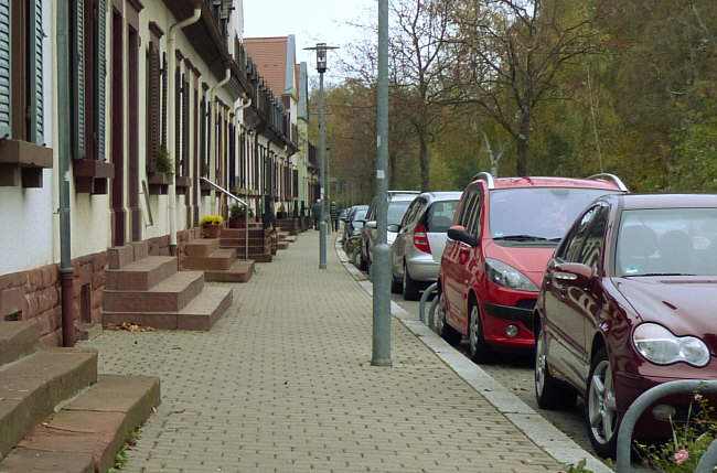 mit dichter Bebauung, aber auch ein paar Bäumen und Rabatten.