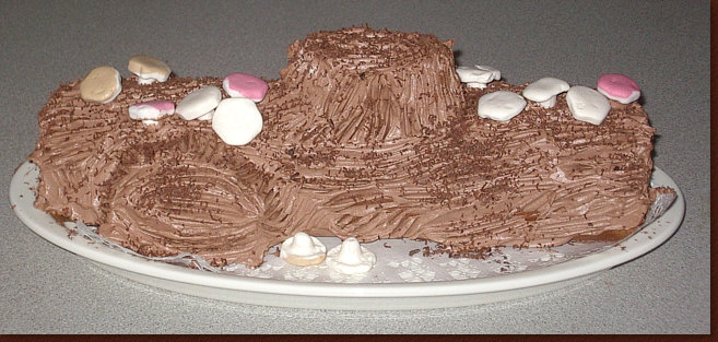 die äußere Cremeschicht rillenartig verziert, um die Borke nachzuahmen.