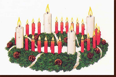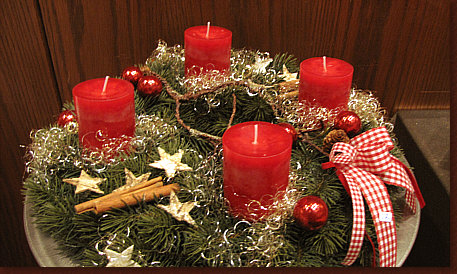 einen Holzkranz eine Art Kalender mit 20 kleinen und 4 großen roten Kerzen,