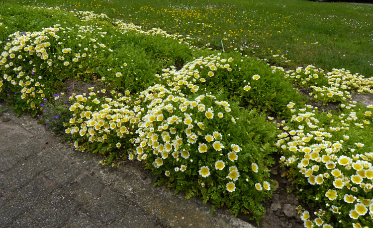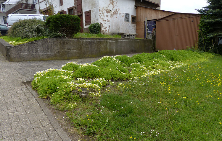 Auf den ersten Blick ein normaler Vorgarten mit weiß blühenden Polsterstauden.