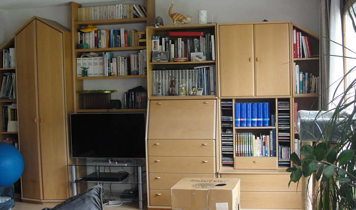 ... sich vor den Tisch stellt und in Richtung linkes Regal schaut ... dann sieht