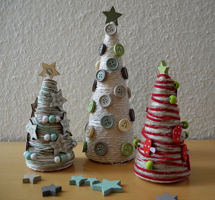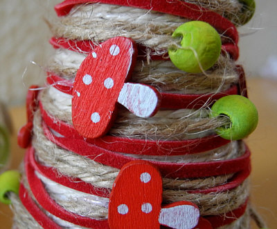 Die kleinen Tannen werden mit verschiedenen Schnüren und Perlen